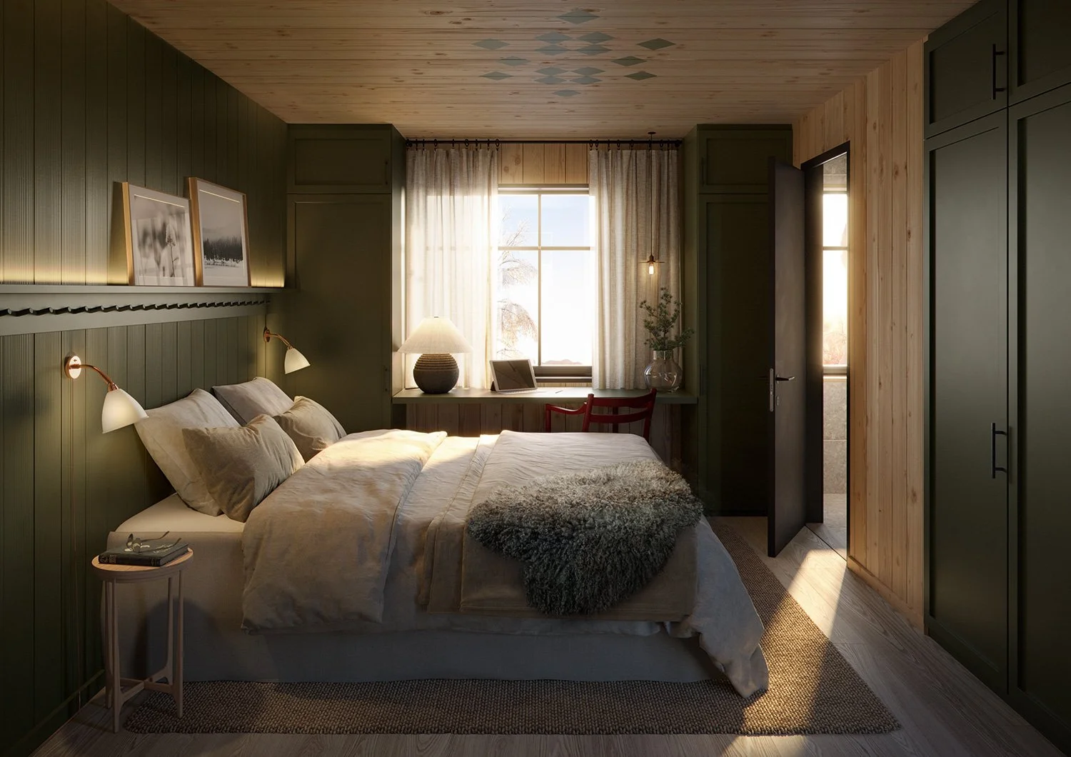 Hemmets master bedroom är en harmonisk plats för vila och återhämtning. Här får du plats med en generös säng och i rummet finns gott om förvaring i form av inbyggd garderob och knopplist för upphängning. I listen finns också inbyggd belysning som skänker ett mjukt sken. Avskilt arbete eller studier sker med fördel vid det platsbyggda skrivbordet. Husens mindre sovrum bjuder på ombonade sovplatser med smart förvaring. Våningssängarna i trä är dekorerade med allmogedetaljer och har ett draperi som kan dras för när du vill sova extra mörkt eller vara för dig själv.