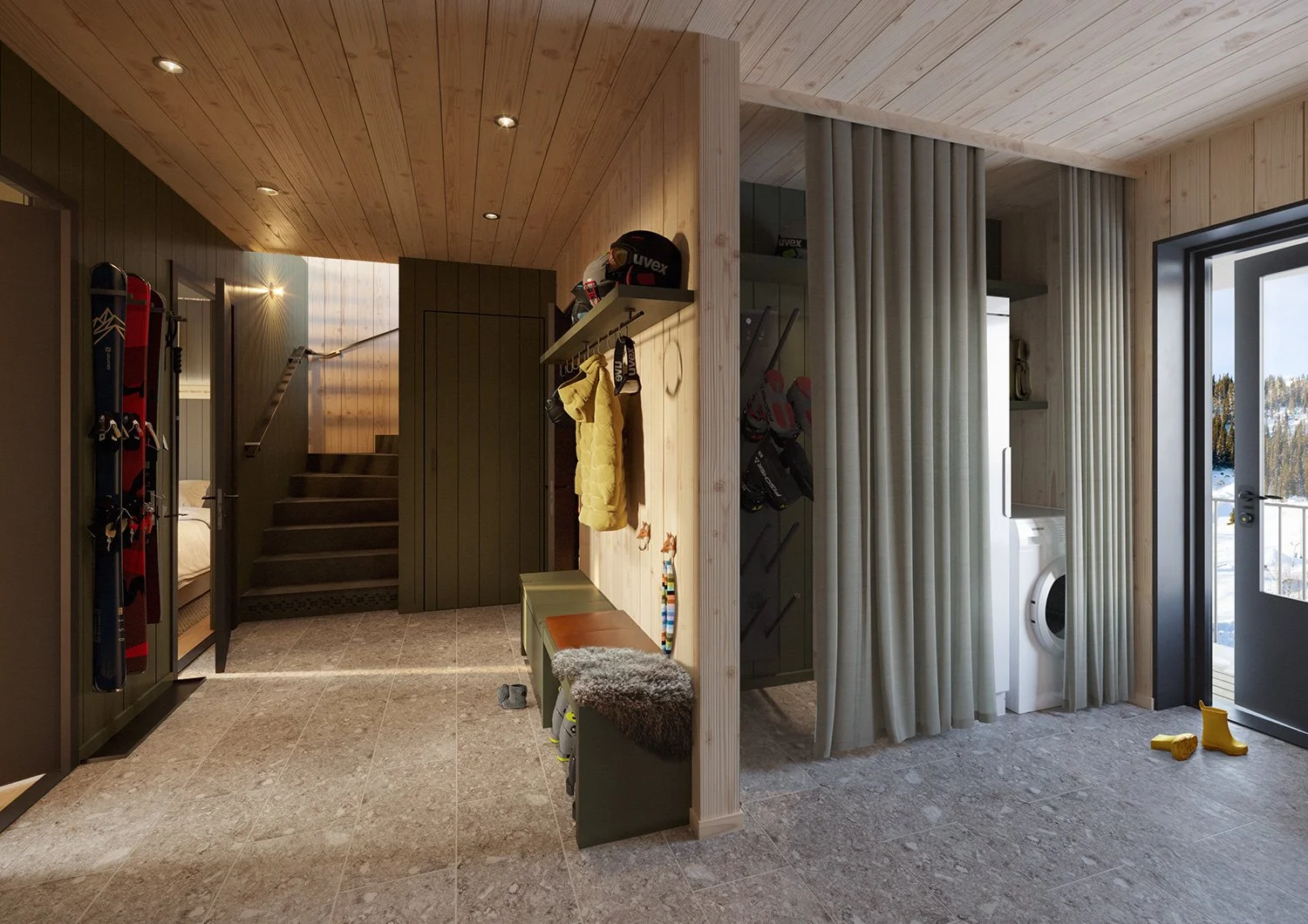 Husens entréer är varma och funktionella. Här får du plats med förvaring av skidor, en hallmöbel tar hand om alla skidkläder efter en dag i skidbacken. Här finns även pjäxvärmare, torkskåp och tvättmaskin. Allt för att du enkelt ska kunna förbereda dagen och så alla kan komma iväg utan att behöva trängas.